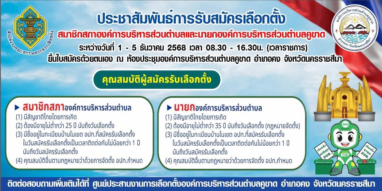 ประชาสัมพันธ์การรับสมัครรับเลือกตั้ง สมาชิกสภาองค์การบริหารส่วนตำบลคูขาดและนายกองค์การบริหารส่วนตำบลคูขาด ระหว่างวันที่ 1-5 ธันวาคม 2568 ยื่นใบสมัครได้ด้วยตนเอง ณ ห้องประชุมองค์การบริหารส่วนตำบลคูขาด